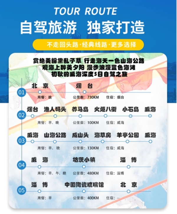 早8点 京台高速(G3)万庄服务区集合,粘车贴,发手台,随后车队出发前往烟台,沿途午餐服务区自理。下午到达后入住酒店,酒店晚餐后自由活动,可以前往所城里逛一逛,感受所城里的烟火气和美丽的夜景。